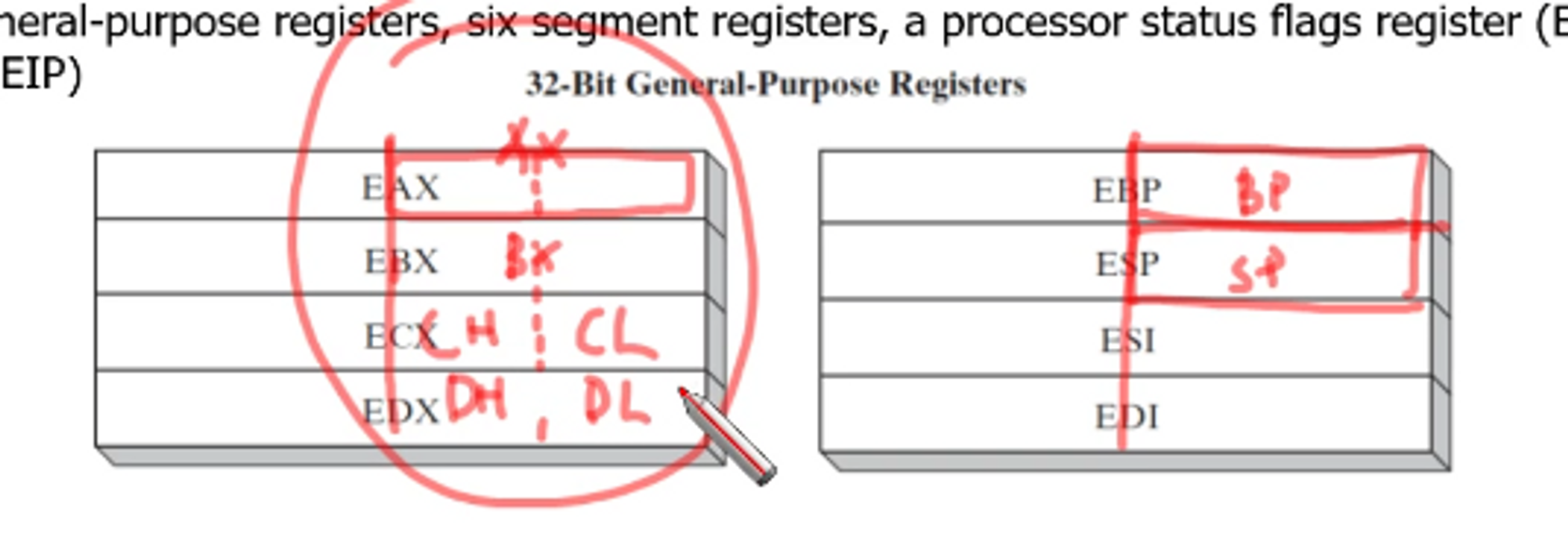 이런식으로 EAX, EBX, ECX, EDX는 다 자를 수 있지만, EBP 와 ESP 같은 경우 과거 8비트 체계에서는 없던 것들이라서 BP와 SP는 자를 수가 없다.