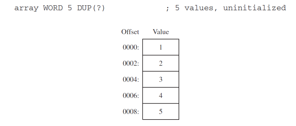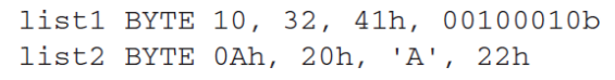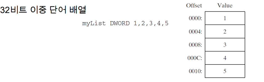 list BYTE 10, 20, 30, 40 이렇게 선언을 한 경우 다중 이니셜라이즈가 되는데 이렇게 첫번째 이니셜 라이즈의 오프셋만 참조를 하게 된다. (list는 첫번째 녀석)
