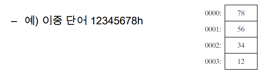 - X86 프로세서는 리틀앤디안 순서(낮음에서 높음)을 사용하여 메모리에서 데이터를 저장하고 검색한다.