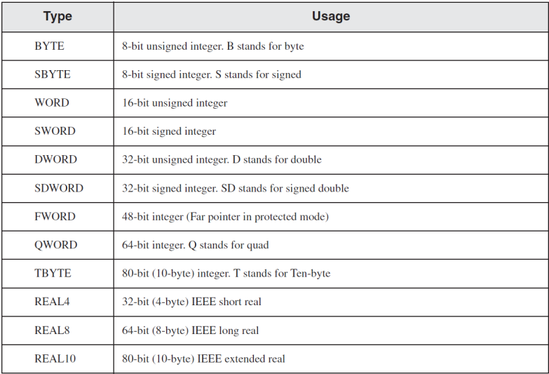 - 실제로 크기가 같아도 다른 용도로 쓰기위해서 각자 용도를 고려해서 자료형을 정의하지만 어셈블리어에서는 오로지 크기의 관점으로만 데이터 타입이 주어진다.