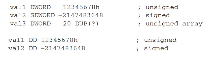 - DWORD, SDWORD, REAL4 는 32bit 정수에 사용 가능( 같은 결과)