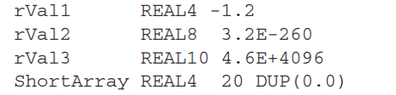 - REAL4는 4바이트 단정밀도 부동소수점 변수를 정의한다. (C언어에서 float)