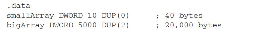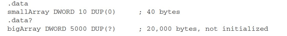 - 초기화되지 않은 큰 데이터 블록을 정의할 때 .DATA? 지시어를 사용하면 컴파일된 프로그램의 크기를 줄일 수 있다.