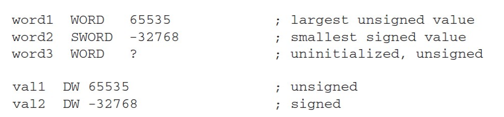 - DWORD, SDWORD, REAL4 는 32bit 정수에 사용 가능( 같은 결과)