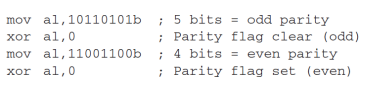 - 패리티 플래그는 명령이 대상 피연산자의 로우 바이트에 짝수 1비트를 생성할 때 설정됩니다.