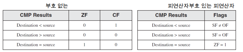 실제로 비교는 SUBSTACTION을 하는 것 뿐이다. 다만 이 연산은 DESTINATION(피연산자)를 업데이트 하지 않는다. (뺄셈을 시도해보는 것 뿐..!)