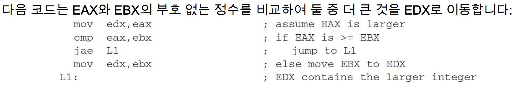 jg L1 ; jump if greater조건부 점프 명령의 유형