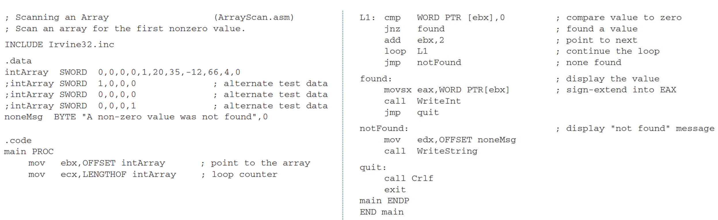 다음 프로그램은 16비트 정수 배열에서 첫 번째 0이 아닌 값을 찾습니다