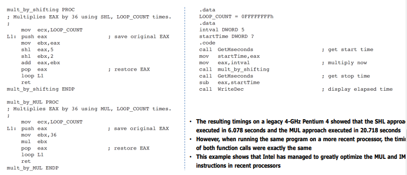 - 곱셈은 shift연산의 합으로 표현할 수 있다. 일반 곱셈명령과 곱셈간의 차이점을 보는 것이다.