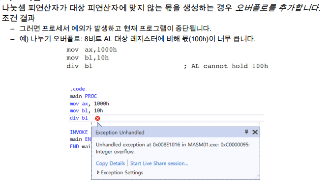 - AL은 1바이트 인데…! 2바이트가 결과값이므로 oveflow가 발생할 수 있다. (몫이 100이니까 결과값이 AL(4비트)에 저장되니까 overflow가 발생한다.