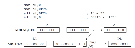 - adc를 사용해서 더해주면.. 이전에 Carry가 1이 세팅 됐기 때문에 1이 된다.