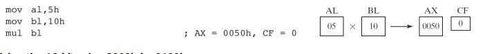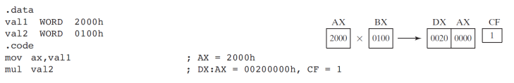 - 16비트인 경우에는 AX로 곱하고 결과값은 DX,AX레지스터에 위와 아래로 나뉘어서 들어가게 된다.