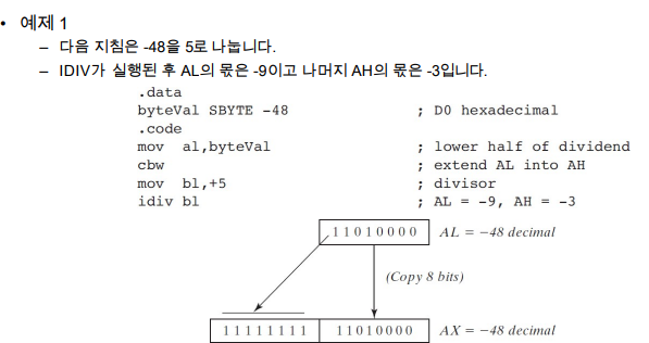 - CBW(Convert Byte to word) : AL의 부호비트를 AH로 확장해서 숫자의 부호를 유지한다.