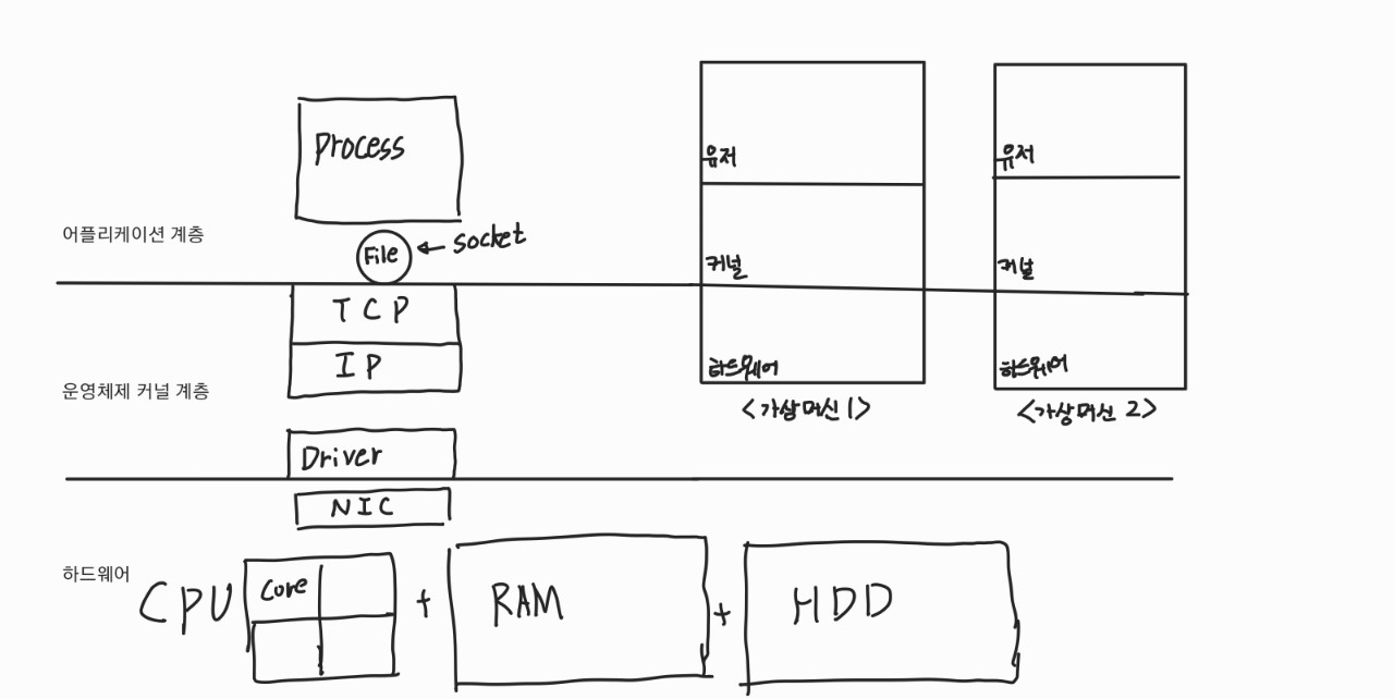 하드웨어는 CPU, RAM, HDD(하드디스크),NIC(네트워크 인터페이스 카드) 등등 컴퓨터의 기계적인 부품을 의미합니다.