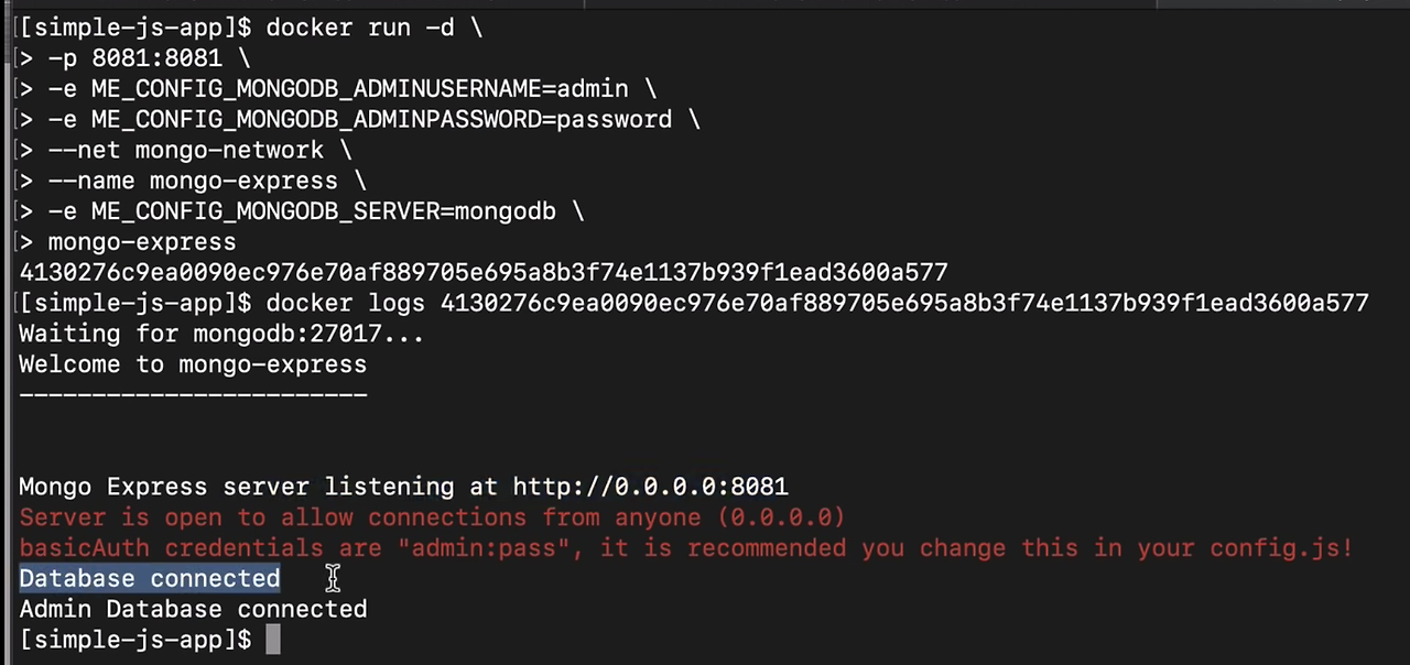 docker run -d \ -p 8081:8081 \ -e ME_CONFIG_MONGODB_ADMINUSERNAME=admin \ -e ME_CONFIG_MONGODB_ADMINPASSWORD=passwiord \ --net mongo-network \ --name mongo-express \ -e ME_CONFIG_MONGODB_SERVER=mongodb \ mongo-express