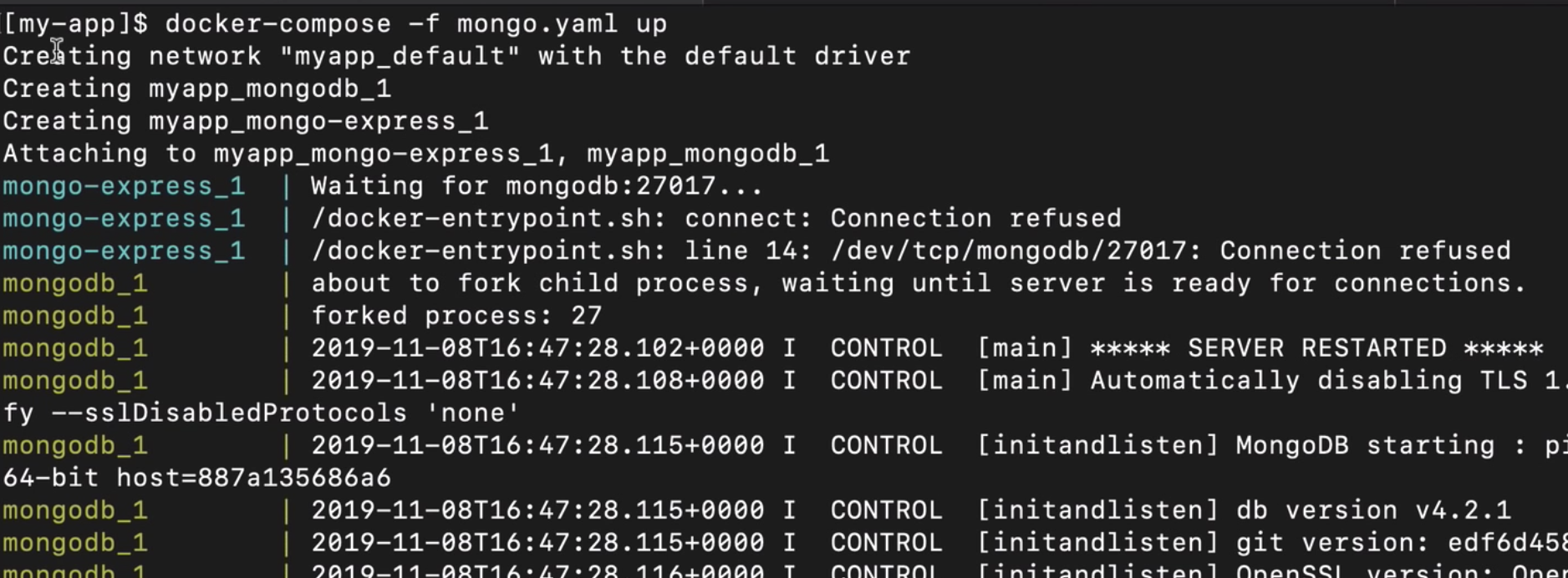 만약 실행 경로에 docker-compose.yml 이 아닌 다른 이름이나 경로의 파일을 Docker Compose 설정 파일로 사용하고 싶다면 -f 옵션으로 명시를 해줍니다. (예시 : docker-compose -f mongo.yaml up)