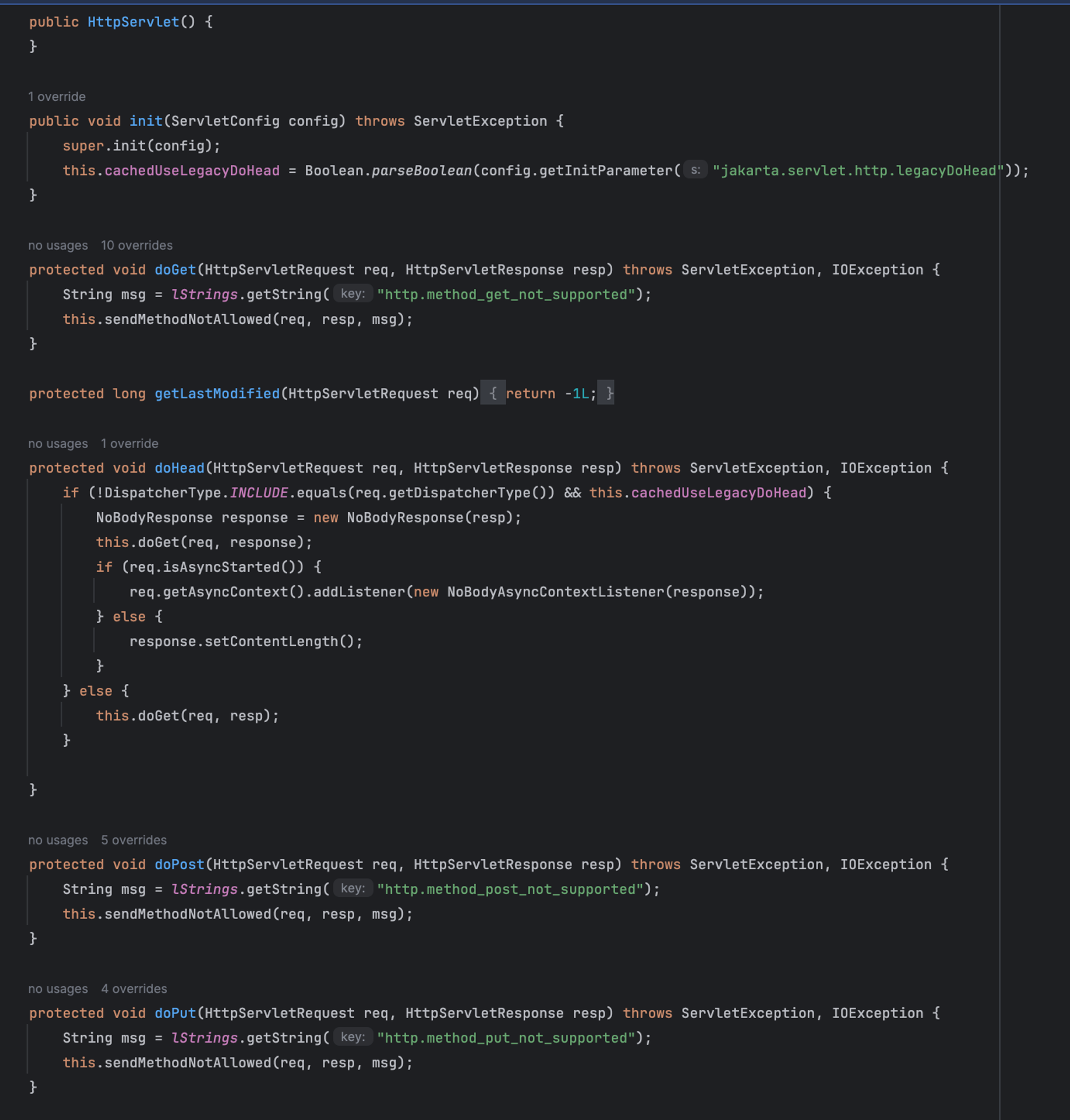 HttpServlet 구현코드를 보면 많은 함수가 있지만 init,doGet,distroy 함수를 봅시다.