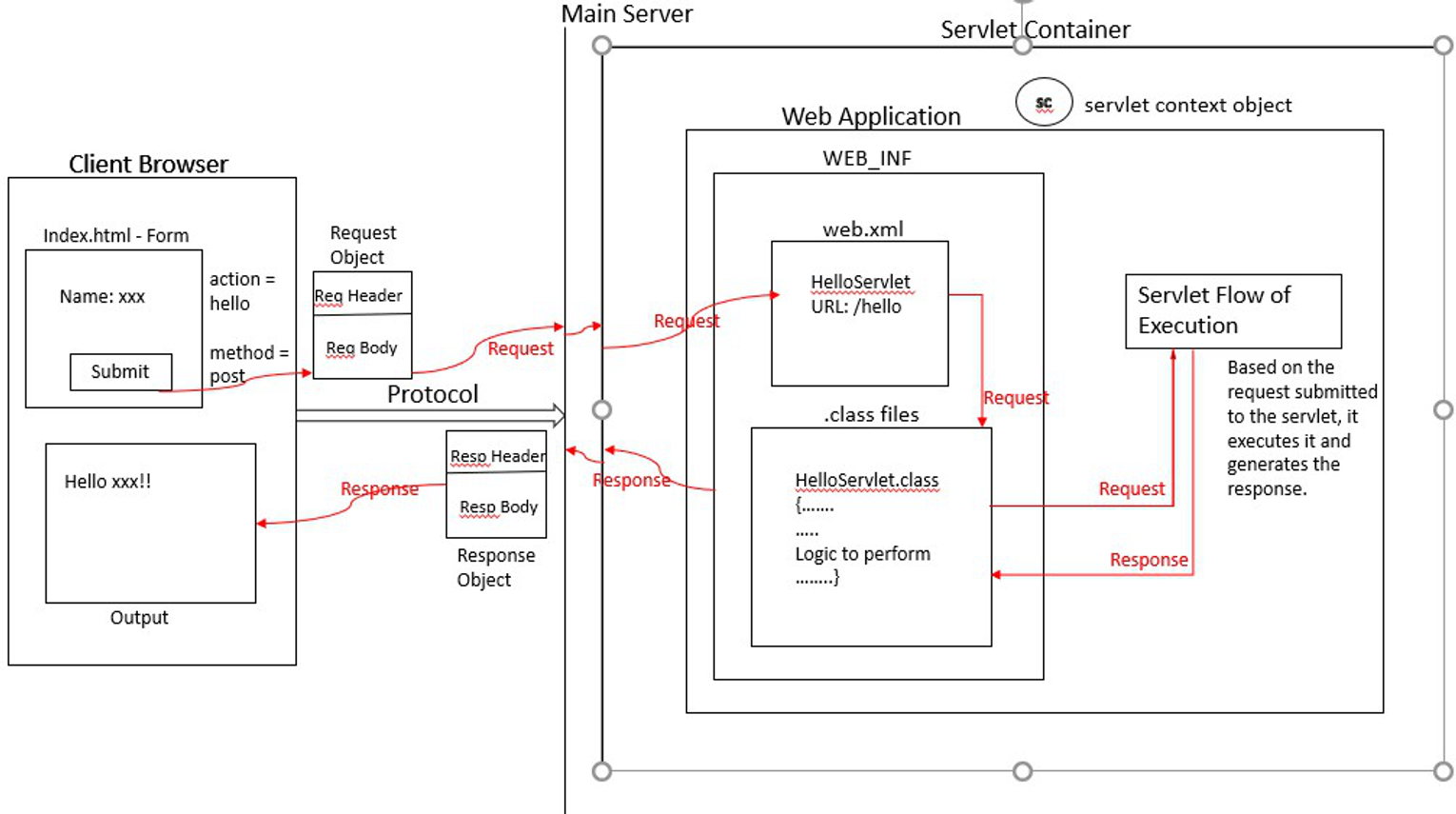 - 폼에서 지정한 내용에 따라, 컨테이너는 URL 패턴(예: "hello")에 연결된 서블릿을 식별하고, 해당 .class 파일이 "classes" 폴더에 있는지 확인합니다.