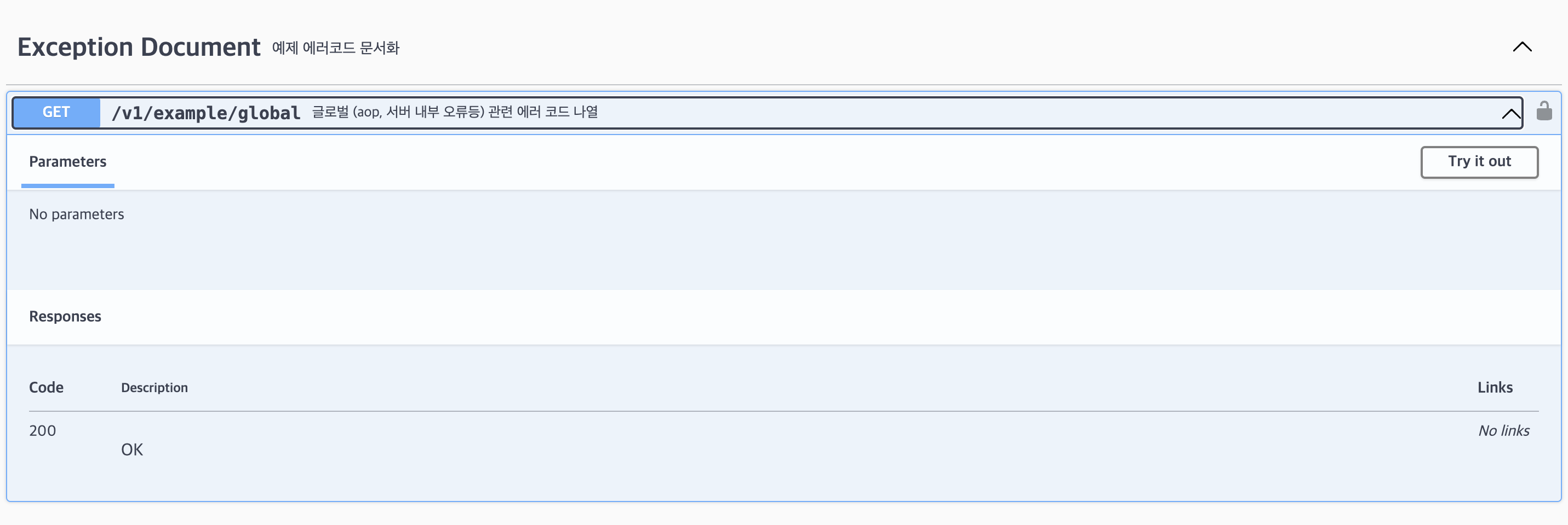 @Tag(name = "Exception Document", description = "예제 에러코드 문서화")