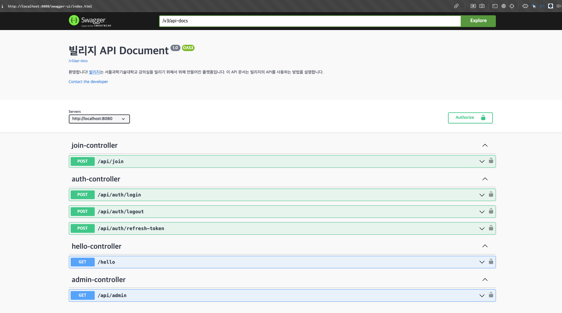 모든 설정이 완료된 후 localhost:8080으로 접속하면 Swagger UI가 정상적으로 작동할 것이다. Swagger UI는 아래와 같은 화면을 제공한다.