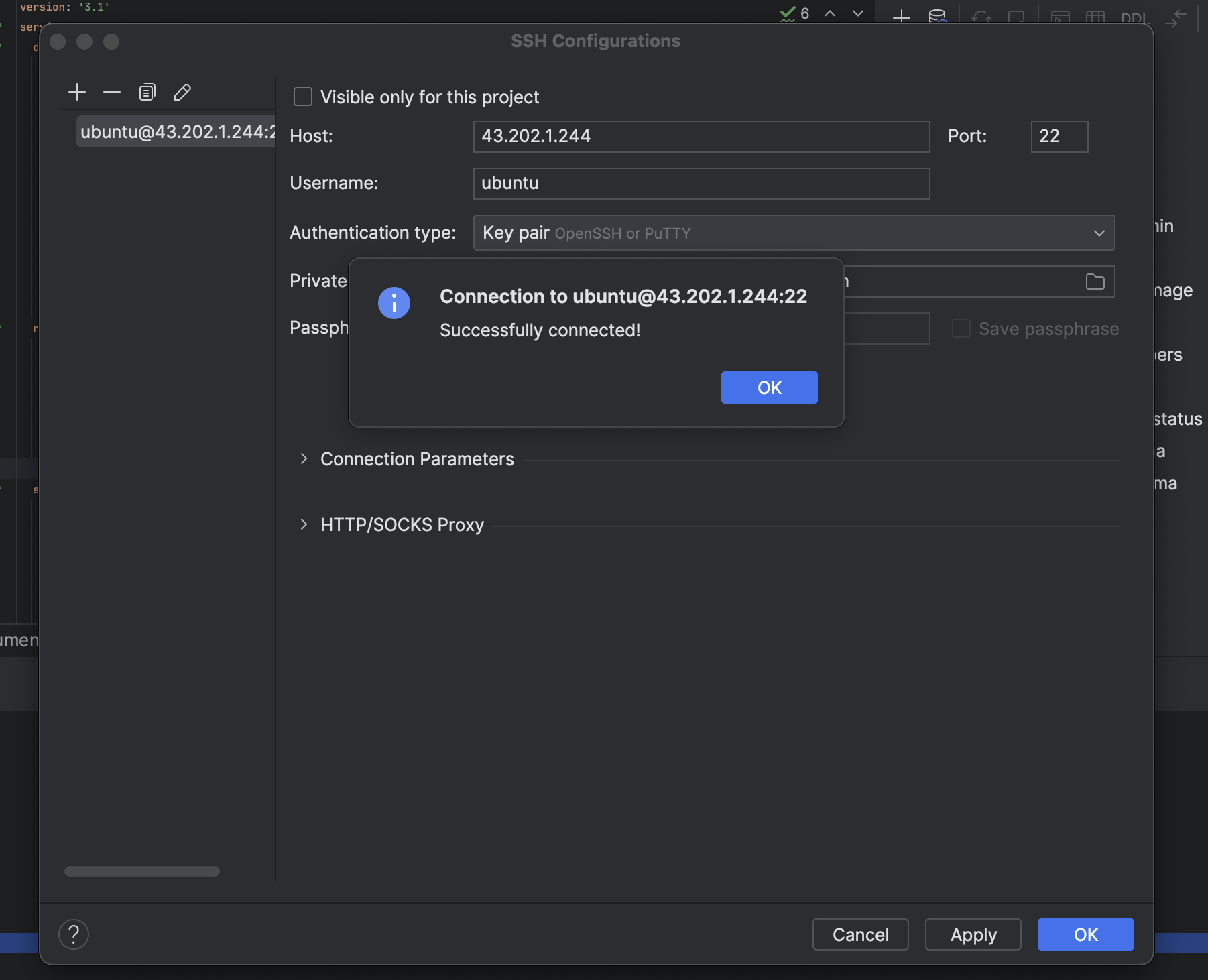 이후, host 에 rds주소값을 넣어주고 port랑 비밀번호를 적어주고 연결을 해준다.