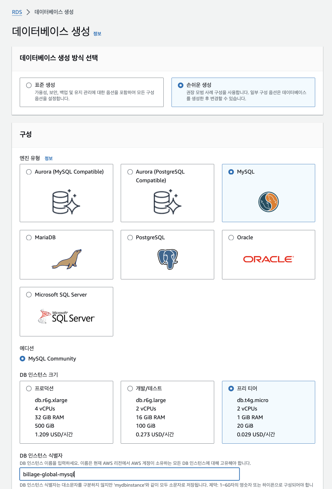 rds이름을 식별자로 이름을 지어주고 인스턴스 크기를 프리티어로 설정해주자.