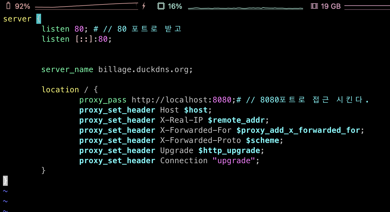 proxy_pass http://localhost:8080; // 8080포트로 접근 시킨다.