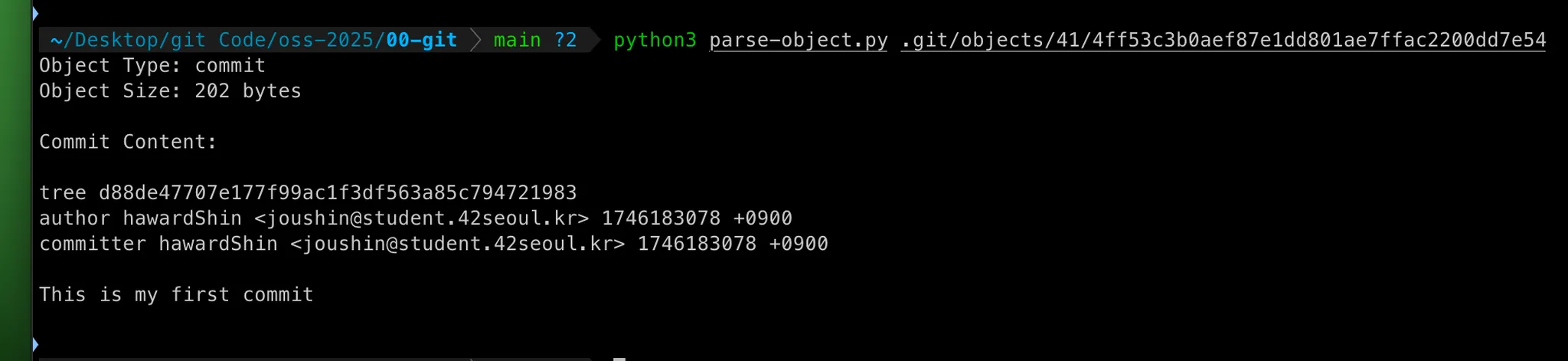 커밋 오브젝트 객체 는 tree, parent 그리고 커밋 관련 정보 (author, comitter, commit message) 로 구성되어 있다.