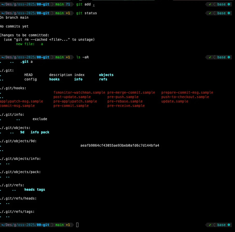확인해보면 git add를 진행했을 때 새로운 파일이 tracked상태로 변경됐고 git 에 objects에 해시값 파일이 생긴 걸 볼 수가 있다.