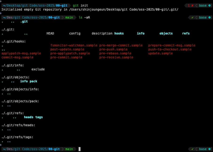 .git/ 폴더가 생긴다. objects, refs, HEAD 등 기본 디렉터리가 초기화된다.